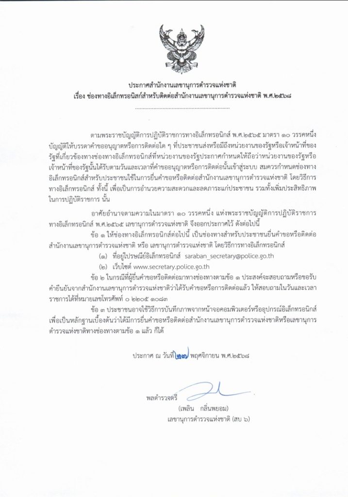ประกาศช่องทางอิเล็กทรอนิกส์สำหรับติดต่อสำนักงานเลขานุการตำรวจแห่งชาติ พ.ศ.2568